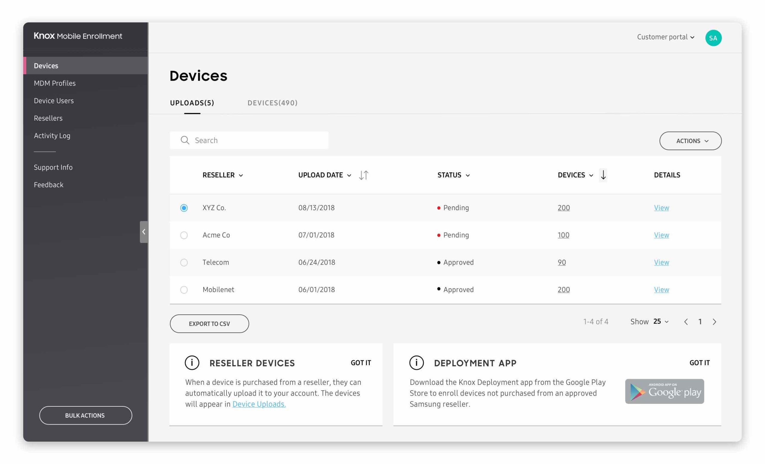 Knox erlaubt auch das massenweise Registrieren kompatibler Geräte („Mass Enrollment“). Dies kann etwa notwendig sein, wenn die gesamte Unternehmensflotte umgestellt oder erneuert wird. Damit ähnelt es in seiner Funktionsweise dem „Device Enrollment Program“ (DEP) von Apple.